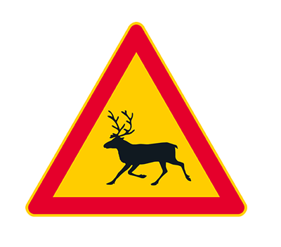 In Northern Finland, reindeer are common on the roads, especially in rural and forested areas. To alert drivers, there are specific road signs depicting a reindeer, often placed at points where reindeer are frequently seen or where they cross the road.